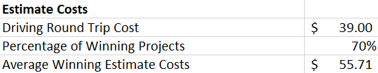 To account for this, we multiply by our desired wage and divide by our percentage of winning projects to calculate our ‘average winning estimate wages‘ – how much we’ll add to the price of the project to pay for our estimate time.