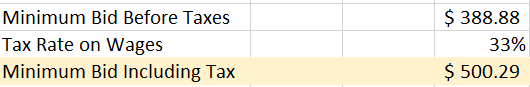 We all know that whether we like it or not, Uncle Sam comes around asking for his share. All of your costs besides labor should be deductible, meaning that we only need to pay taxes on our wages. We’ve estimated a 33% tax rate on our wages, but this will be different depending on your specific tax situation. Update the ‘tax rate on wages‘ row accordingly. That will update your ‘Minimum Bid Including Tax‘ row – which is what we recommend you estimate for a typical tractor project based on the criteria you entered.