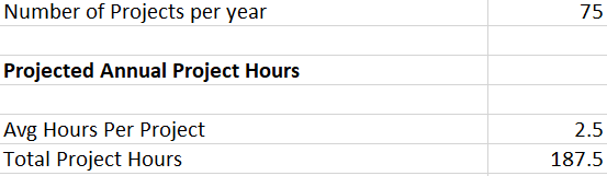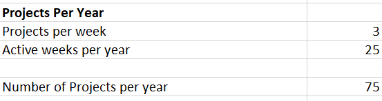We’ll compute this by determining how many projects you do in a typical week, and then how many active weeks you have in a year. We estimated 3 projects per week and 25 active weeks per year (the ground freezes here in Indiana), giving us a total of 75 projects. Edit these as you see fit to get your total number of projects per year. This will automatically update as you change the ‘projects per week’ and ‘active weeks per year’ numbers.