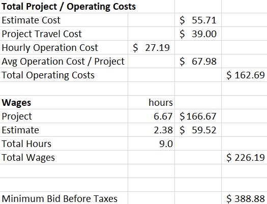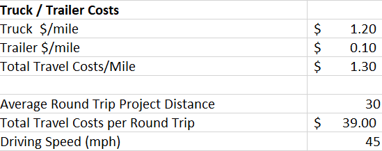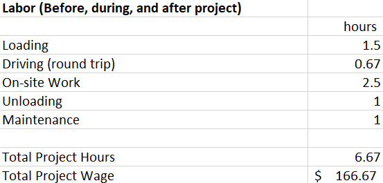 When the time comes for the actual project, you will have to spend time loading, driving, unloading, and performing maintenance in addition to the onsite work. You can update each of these categories, which will automatically update the ‘total project hours‘ row. We then multiply by our desired wage to come up cost for our labor related to the project itself.