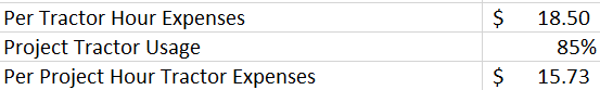 It’s rare to run your tractor the entire time you’re at the project – we’ve estimated that the tractor is running only about 85% of the time. You can adjust this up or down based on the types of projects you normally do. This will update the ‘Per Project Hour Tractor Expenses‘ – which totals tractor operation costs in terms of project hours, not tractor hours.